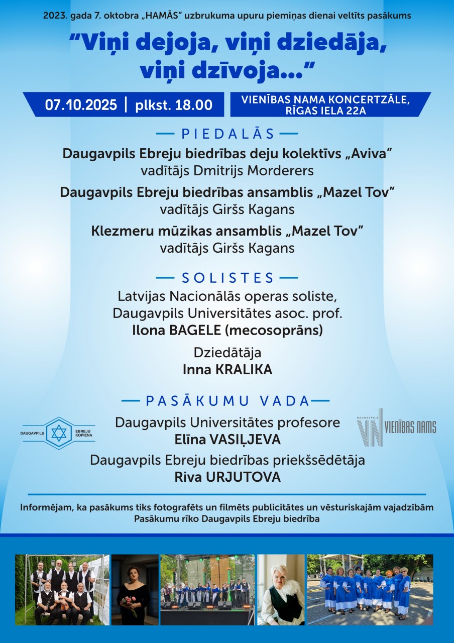 Šī gada 7. oktobrī plkst 18.00 Vienības Nama koncertzālē (Rīgas ielā 22a) notiks HAMĀS uzbrukuma upuru piemiņas dienai veltīts pasākums „Viņi dejoja, viņi dziedāja, viņi dzīvoja…".