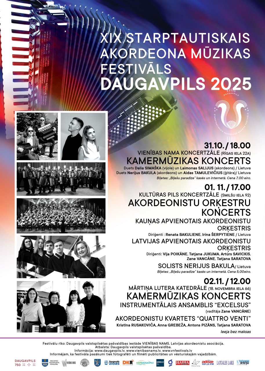 Kamermūzikas koncerts Vienības nama koncertzālē (Rīgas ielā 22a) 31. oktobrī plkst. 18.00. Tajā uzstāsies divi enerģiski dueti no Lietuvas. Viens no tiem būs Dalia Simaška (vijole), Laimonas Salijus (akordeons), kuru izpildījumā varēs dzirdēt gan klasisko mūziku, gan mūsdienīgu un novatorisku mūziku, savukārt otrs duets, kurā apvienojušies džeza akordeonists Nerijus Bakula (akordeons) un jaunākās paaudzes čigānu džeza ģitārists Aidas Tamulevičius (ģitāra) atklās čigānu džeza, svinga, tango un parīziešu šansonu skaņu burvību. Ieejas biļete 7,00 eiro.