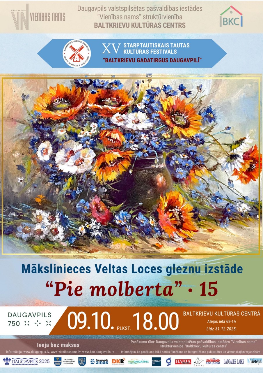 Baltkrievu kultūras centrā notiks Veltas Loces jubilejas izstādes atklāšana![]() Ceturtdien, 9. oktobrī, plkst. 18.00 Vienības nama Baltkrievu kultūras centrā (Alejas ielā 68-1A) XV Starptautiskā tautas kultūras festivāla „Baltkrievu gadatirgus Daugavpilī” ietvaros notiks mākslinieces Veltas Loces personālizstādes „Pie molberta” atklāšana. Veltas Loces izstāde ir veltīta viņas radošās darbības 15 gadu jubilejai. Arī izstādes norises vieta izvēlēta zīmīgi – tieši Baltkrievu kultūras centrā pirms 15 gadiem māksliniece pirmo reizi plašākai sabiedrībai atklāja savu mākslu. Šo gadu laikā Veltas Loces radošajā portfolio ir ap piecdesmit izstāžu un viņa ir kļuvusi par Daugavpilī labi pazīstamu mākslinieci. Viņas darbi – ainavas, ziedi, klusā daba un portreti, piesātināti ar mīlestību pret apkārtējo pasauli, apbrīnu par tās skaistumu un pilnību, kas neatstāj vienaldzīgu nevienu skatītāju. Apmeklēt izstādi Vienības nama Baltkrievu kultūras centrā iespējams līdz 2025. gada 31. decembrim. Ieeja bez maksas.