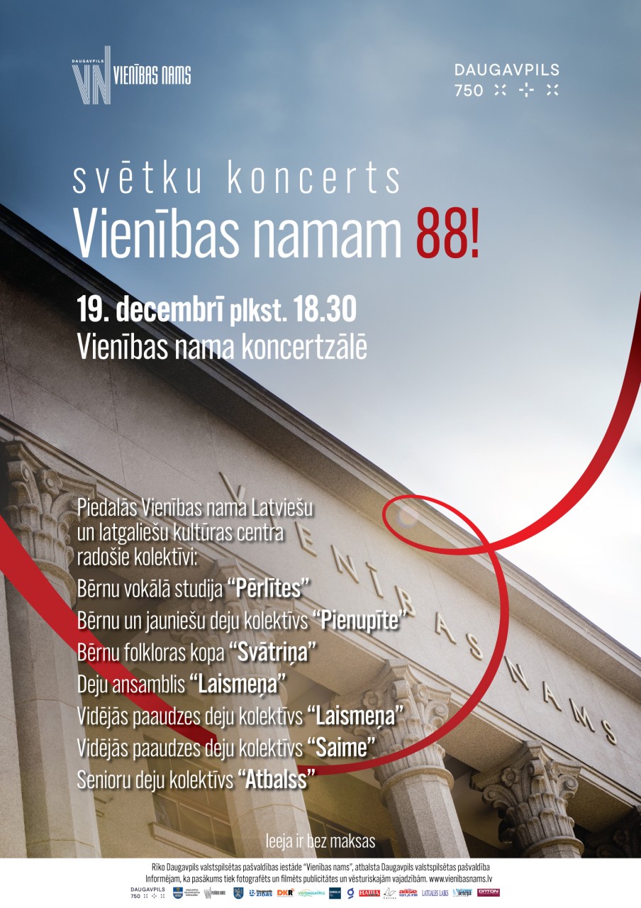 Šī gada 19. decembrī ar svētku koncertu plkst. 18.30 Vienības nama koncertzālē (Rīgas ielā 22a, Daugavpils) savu 88. dzimšanas dienu atzīmēs Vienības nams. Ar jestriem dančiem un skanīgām dziesmām koncertā visus svētku dalībniekus priecēs Vienības nama Latviešu un latgaliešu kultūras centra kolektīvi: Bērnu vokālā studija „Pērlītes” (vadītāja Iveta Ustinskova), Bērnu un jauniešu deju kolektīvs „Pienupīte” (vadītāja Inese Zuģicka), Bērnu folkloras kopa „Svātriņa” (vadītāja Baiba Pankjāne), Deju ansamblis „Laismeņa” (vadītāja Diāna Soldāne), Vidējās paaudzes deju kolektīvs „Laismeņa” (vadītāja Diāna Soldāne), Vidējās paaudzes deju kolektīvs „Saime” (vadītājs Vitālijs Šidlovskis), Senioru deju kolektīvs „Atbalss” (vadītāja Dārta Stašāne). Ieeja koncertā ir bez maksas.