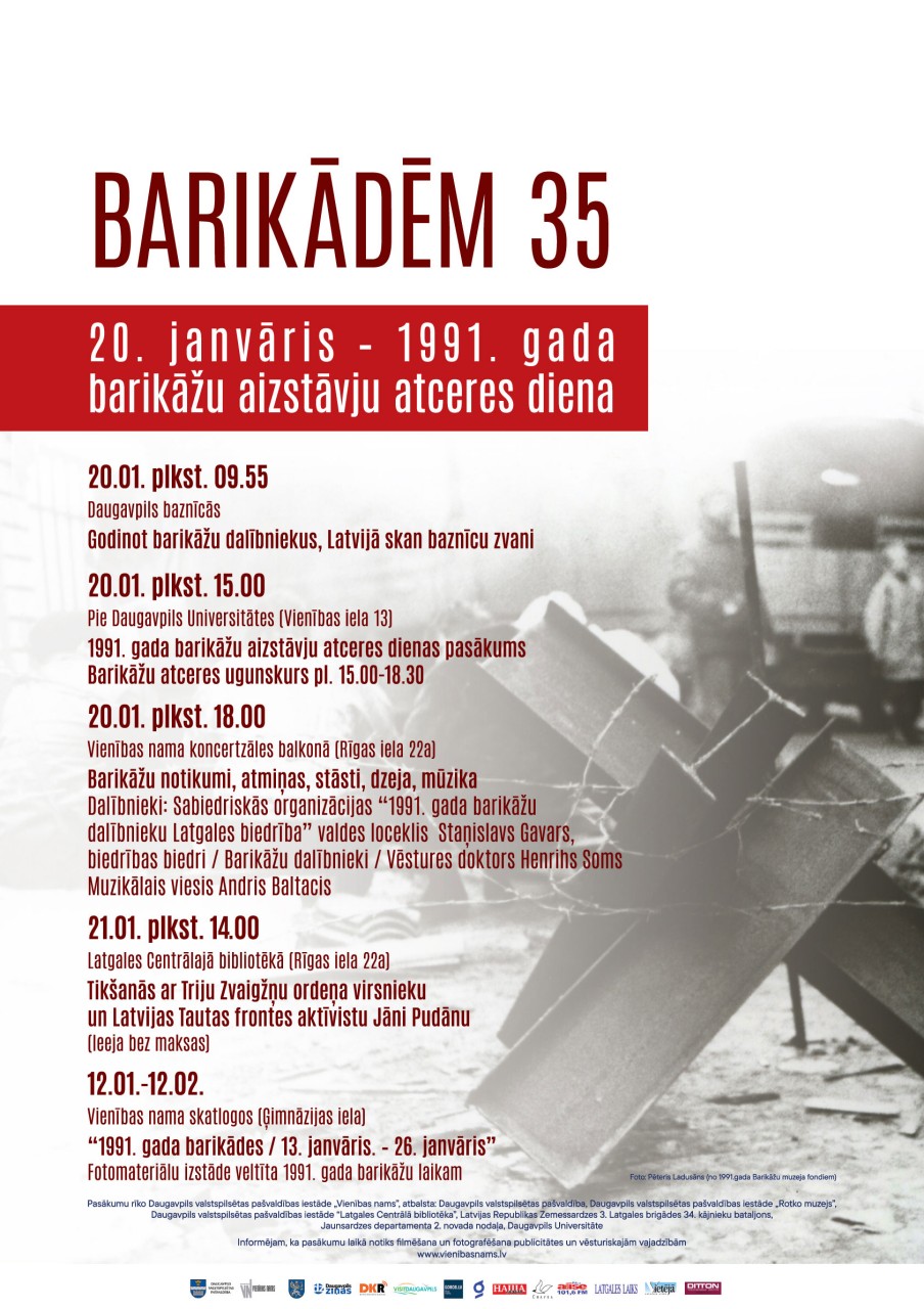 Šī gada 20. un 21. janvārī Daugavpilī notiks pasākumi „BARIKĀDĒM 35”, kas veltīti 1991. gada barikāžu notikumu atcerei. Pasākumu virkni 20. janvārī plkst. 9.55, godinot barikāžu dalībniekus, visā Latvijā, tostarp arī Daugavpilī, uzsāks baznīcu zvanu skaņas un plkst. 10.00 Svēta Mise Sv. Pētera ķēdēs Romas katoļu baznīcā. Plkst. 15.00 pie Daugavpils Universitātes (Vienības ielā 13) notiks 1991. gada barikāžu aizstāvju atceres dienas pasākums. Tā laikā tiks iedegts arī par šīs dienas neatņemu sastāvdaļu un simbolu kļuvušais Barikāžu atceres ugunskurs. Turpinājumā, plkst. 18.00, Vienības nama koncertzāles balkonā (Rīgas ielā 22a) ikviens interesents tiek aicināts uz pasākumu „Barikāžu notikumi, atmiņas, stāsti, dzeja, mūzika…”. Tā būs iespēja tikties ar barikāžu dalībniekiem un Sabiedriskās organizācijas „1991. gada barikāžu dalībnieku Latgales biedrība” biedriem un valdes locekli Staņislavu Gavaru. Vēsturisku ieskatu barikāžu laika notikumos pasākumā sniegs vēstures doktors, tolaik tautas frontes Daugavpils nodaļas valdes loceklis Henrihs Soms. Muzikālais viesis pasākumā būs Andris Baltacis. Savukārt 21. janvārī uz tikšanos ar Triju Zvaigžņu ordeņa virsnieku un Latvijas Tautas frontes aktīvistu Jāni Pudānu aicina Latgales Centrālās bibliotēkas kolektīvs. Pasākums notiks Latgales Centrālajā bibliotēkā (Rīgas iela 22a), sākums plkst. 14.00.